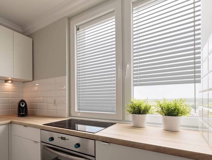 Las persianas empotradas mantienen el aspecto ordenado y minimalista de la ventana. Los productos no sobresalen del marco, no interfieren con otros elementos decorativos (pueden utilizarse junto con cortinas) y encajan armoniosamente en cualquier interior.